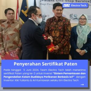 Pada tanggal 4 Juni 2024, Team Electra Tech telah menerima sertifikat Paten untuk invensi “Sistem Pemantauan dan Pengendalian Kandang Peternakan Ayam Berbasis loT” dengan inventor: Kiki Yulianto & Ari Kurniawan selaku tim Electra Tech.